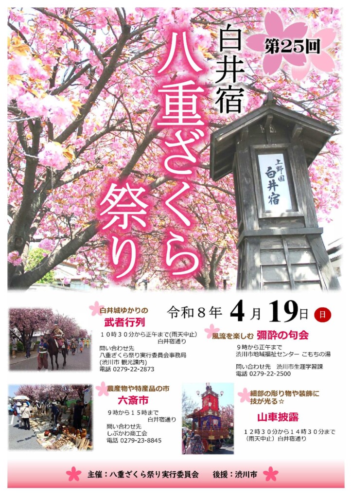 白井宿沿いの八重桜が見頃になる4月下旬に、白井城下の街道のまちとして栄えた白井宿で、戦国武将などの衣装を身にまとった武者行列が行われるほか、農産物・特産品を販売する六斎市、「彌酔(やよい)の句会」と呼ばれる俳句大会が行われます。